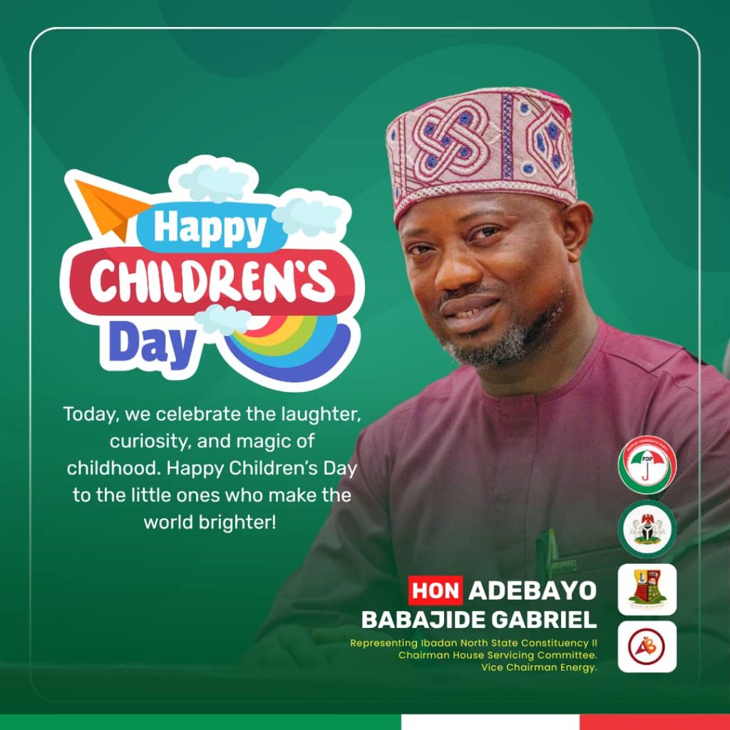 As Nigeria commemorates Children’s Day, the Honourable Member representing Ibadan North Constituency 2 in the Oyo State House of Assembly, Hon. Adebayo Babajide Gabriel, has extended his heartfelt greetings to children across Ibadan North, Oyo State, and the country at large.
