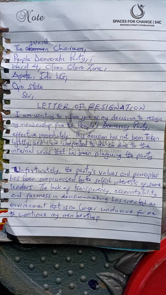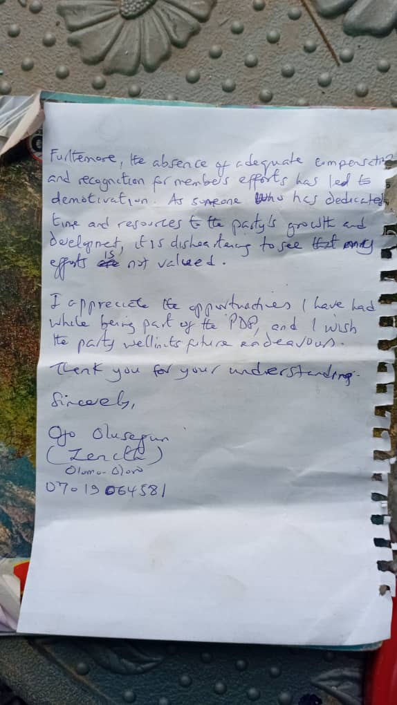 In his resignation letter addressed to the PDP Chairman, Ward 4, Olomo Oloro Zone, Apete, Ido Local Government, and obtained by Today Splash Media Ltd, Ojo expressed deep dissatisfaction with what he described as selfish leadership interests that have eroded the values and principles of the party.