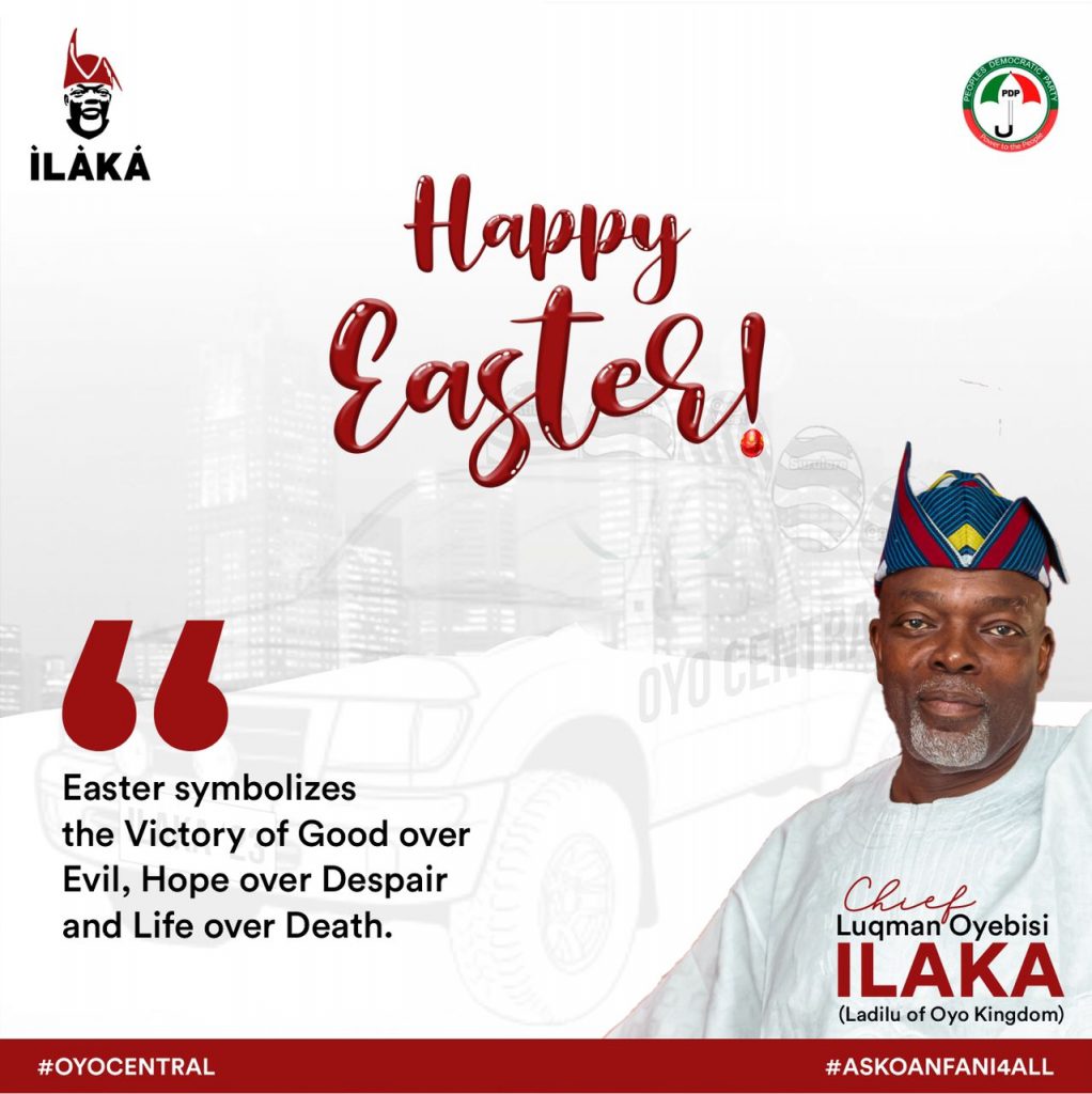 The former Chief of Staff to Oyo State Governor, and the Ladilu of Oyo Kingdom, Chief Bisi Ilaka has congratulated Christians in Oyo Central Senatorial District and across the globe on the occasion of year 2022 Easter season.