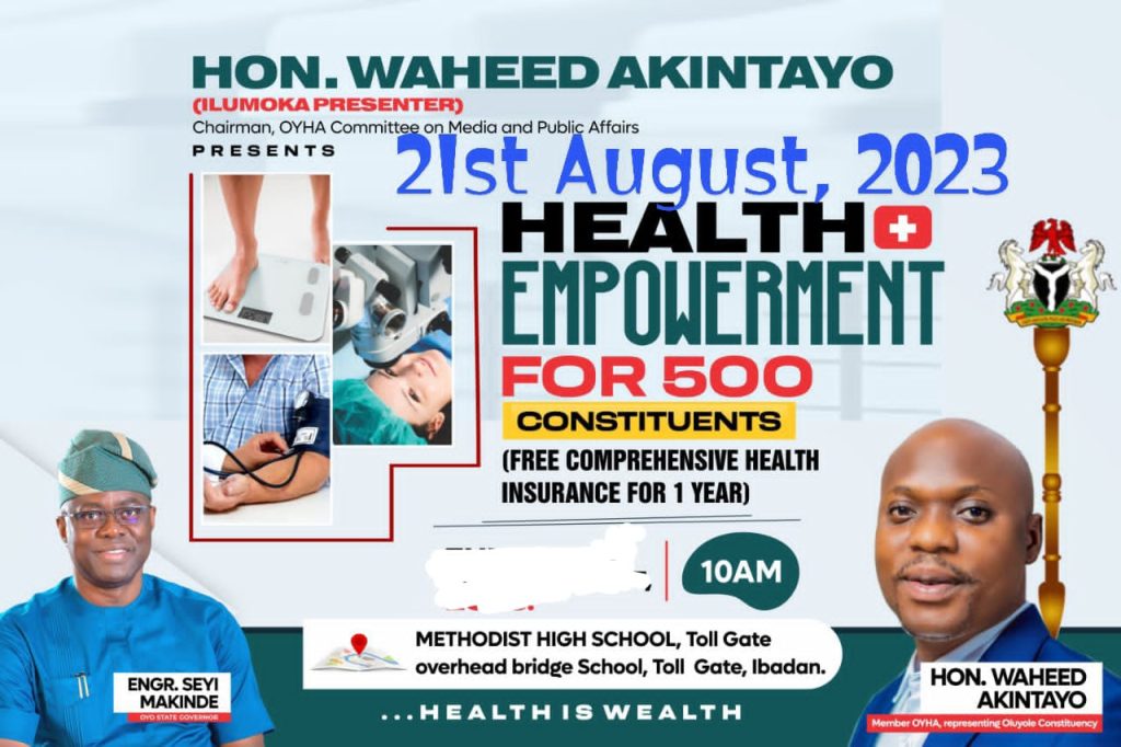 The flag off of free Health Insurance Scheme programme initiated by the lawmaker representing Oluyole State constituency in the Oyo State House of Assembly, Hon. Waheed Akintayo earlier scheduled for Thursday 17th August, 2023 has been postponed till Monday 21st August, 2023.