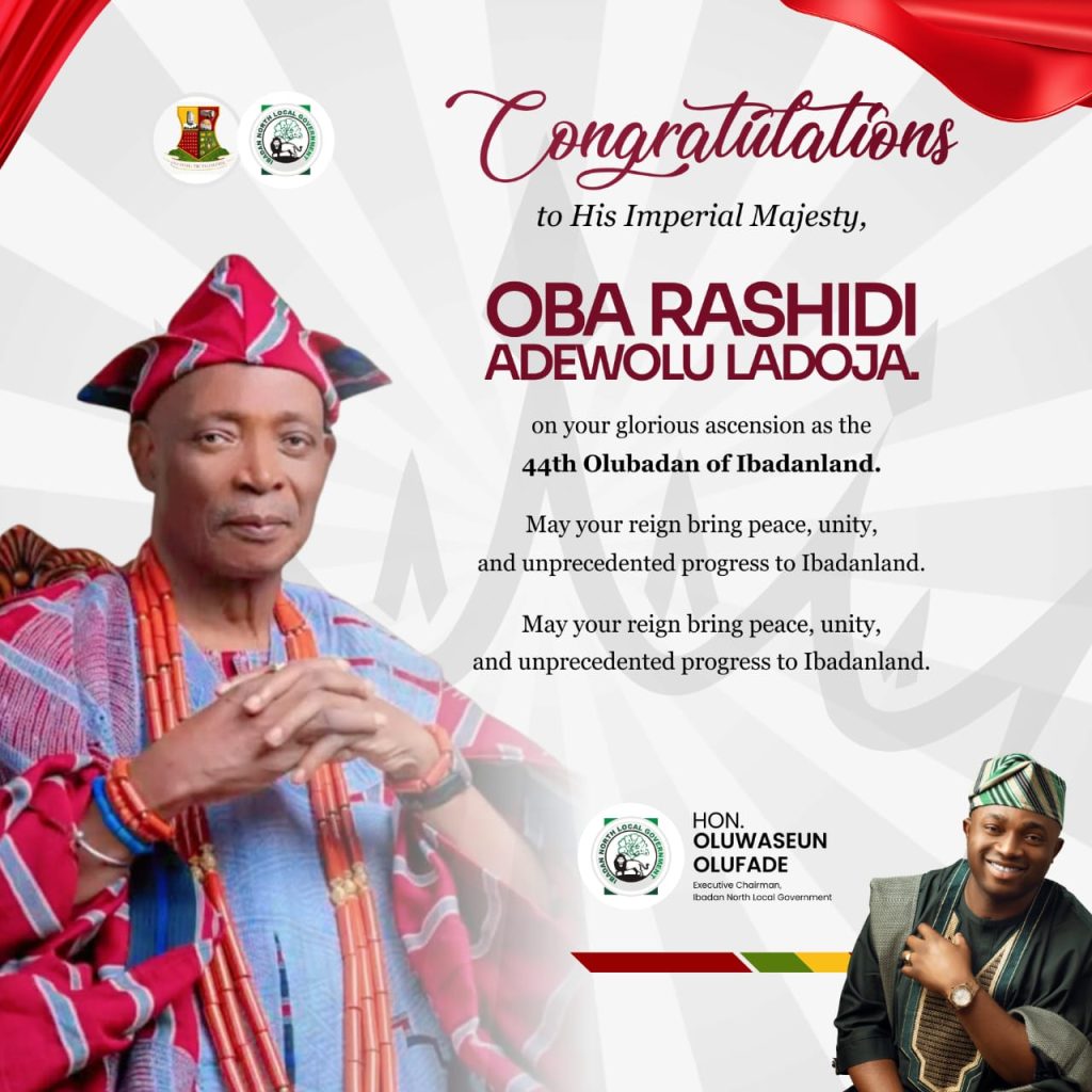 The Executive Chairman of Ibadan North Local Government, Hon. Oluwaseun Olufade, has joined millions of illustrious sons and daughters of Ibadanland at home and in the diaspora to rejoice with His Imperial Majesty, Oba (Senator) Rashidi Adewolu Ladoja, Arusamajere I, on his historic coronation as the 44th Olubadan of Ibadanland.