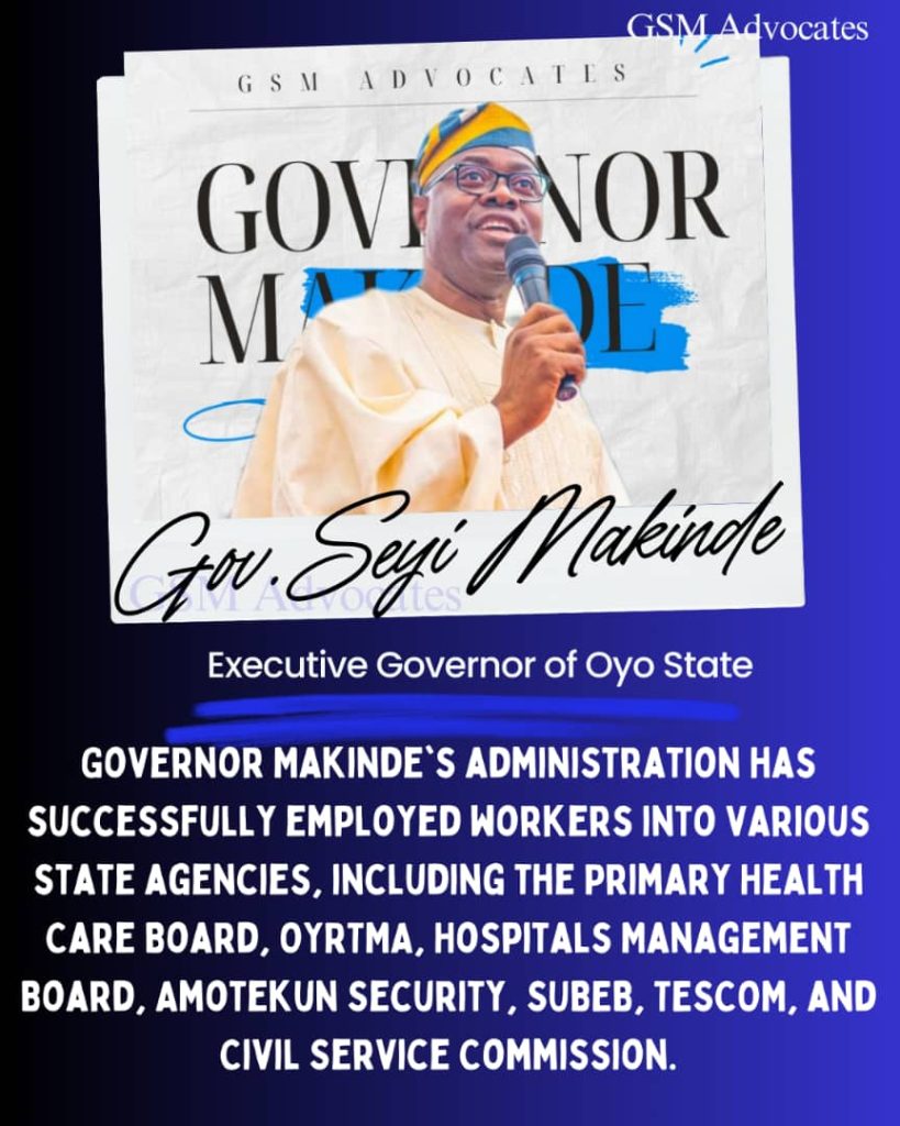Governor Makinde’s administration has successfully employed workers into various state agencies, including the Primary Health Care Board, OYRTMA, Hospitals Management Board, Amotekun Security, SUBEB, TESCOM, and Civil Service Commission.