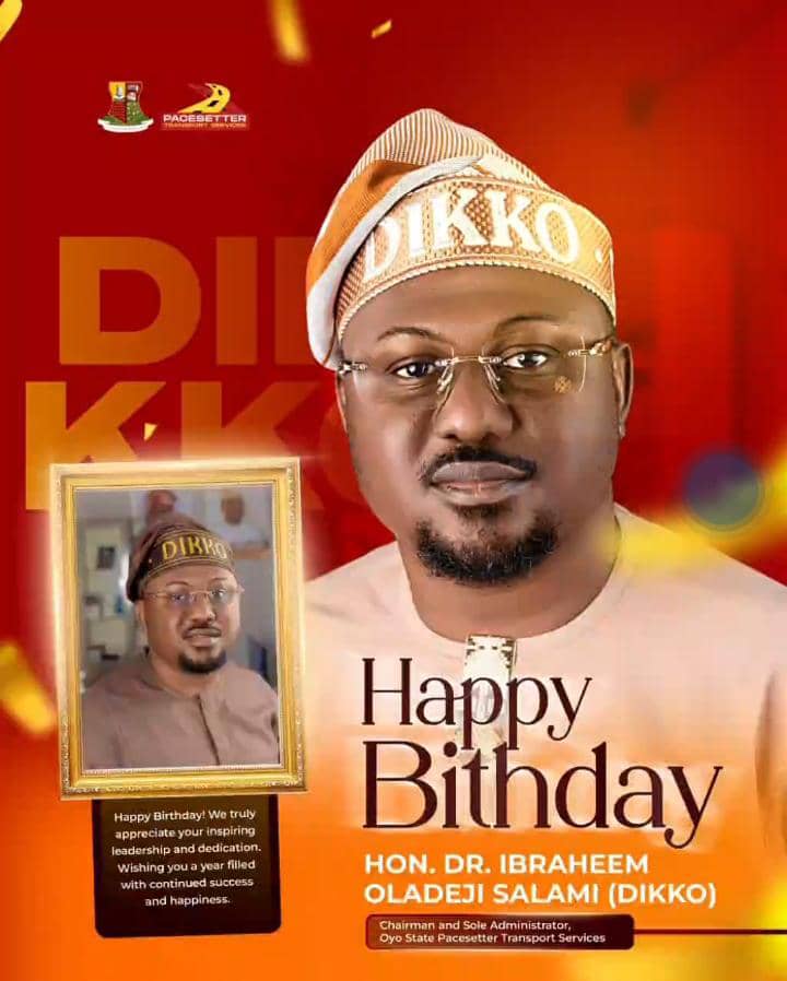 Hon. Adebowale Adebayo Falana, the Chairman of Oyo State Agency for Youth Development, has extended heartfelt congratulations to the Sole Administrator of Pacesetter Transport Services (PTS), Hon. Salami Ibraheem Dikko, on the occasion of his birthday.