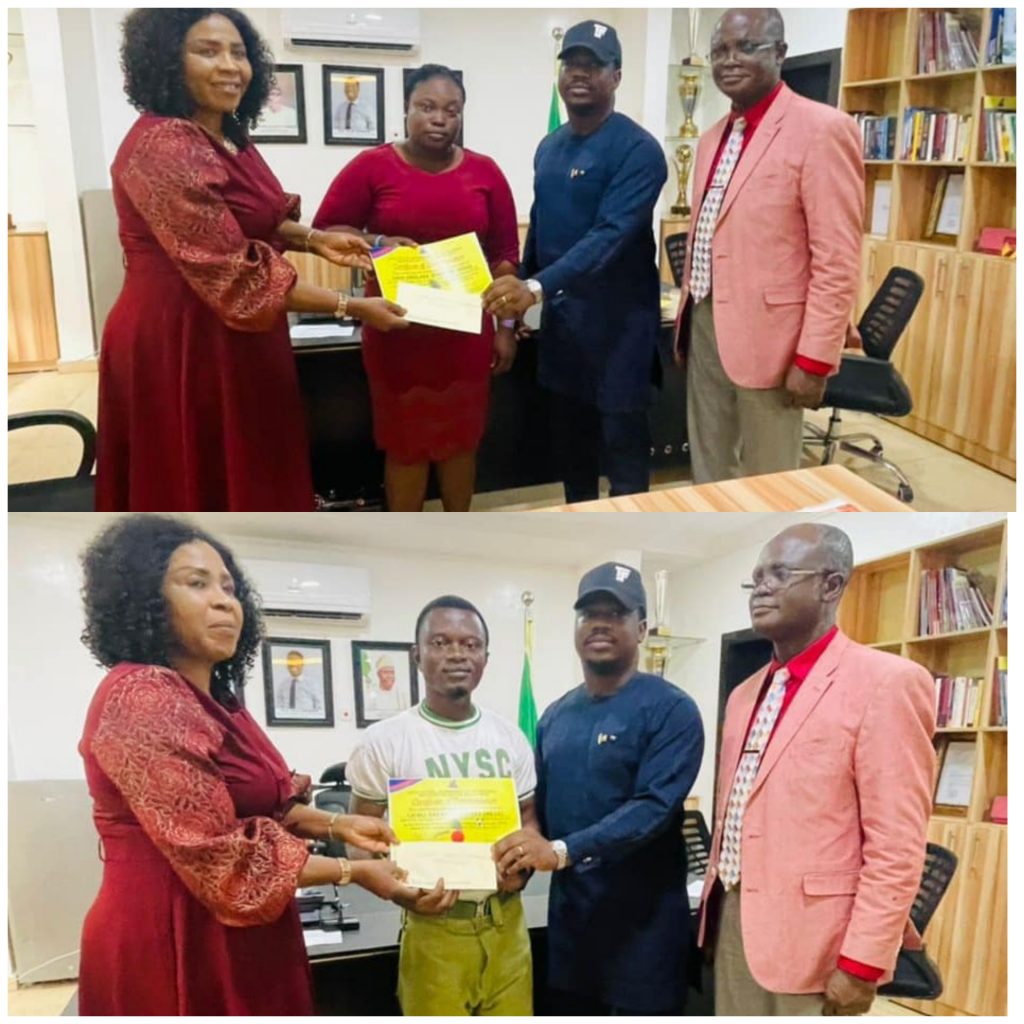 The Oyo State Ministry of Youths and Sports has presented Certificates and gifts to two National Youth Service Corps members, for distinguishing themselves during their service year.