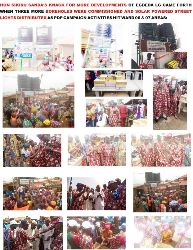 In an impressive display of commitment to Egbeda’s progress, Hon Sikiru Oyedele Sanda, the Executive Chairman of Egbeda LG and PDP’s chairmanship candidate, spearheaded the commissioning of three new boreholes and the distribution of solar-powered street lights during the party’s campaign activities in Ward 06 & 07.